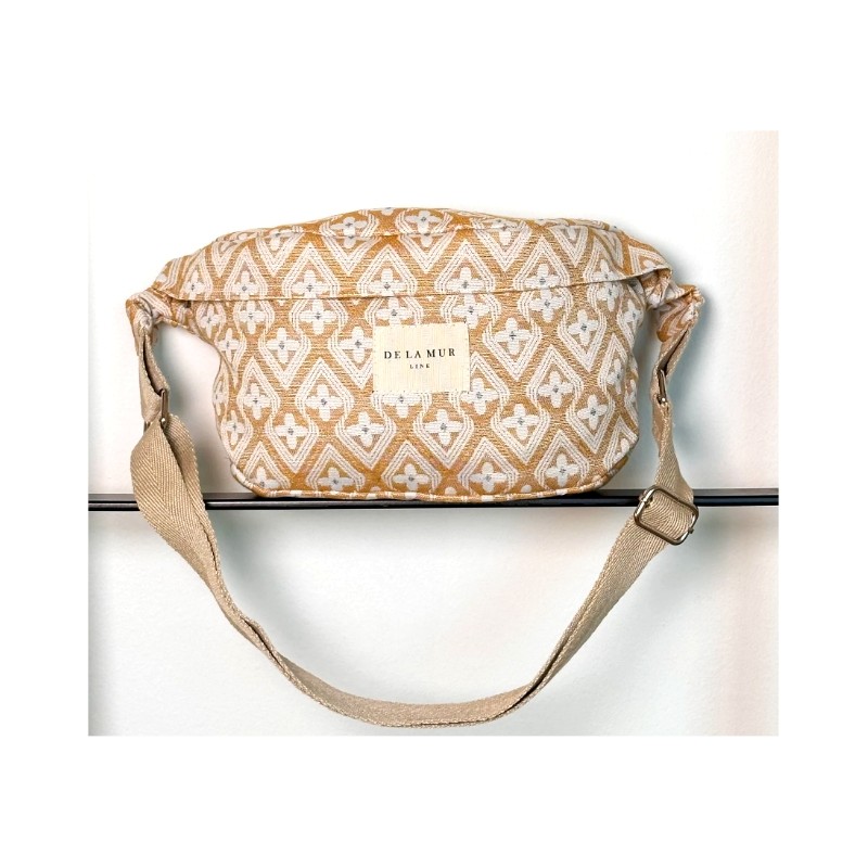 Riñonera tipo bandolera con asa larga ajustable de cinta de espiga de algodón . Confeccionado Con un tejido fino liso . Cierre superior con cremallera. Forrado de tejido grueso en la parte interior.